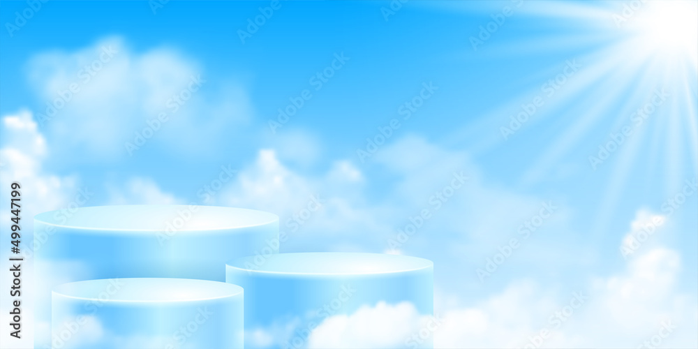 Fototapeta Blue sky background with a 3d product podiums among by clouds under the sunbeams