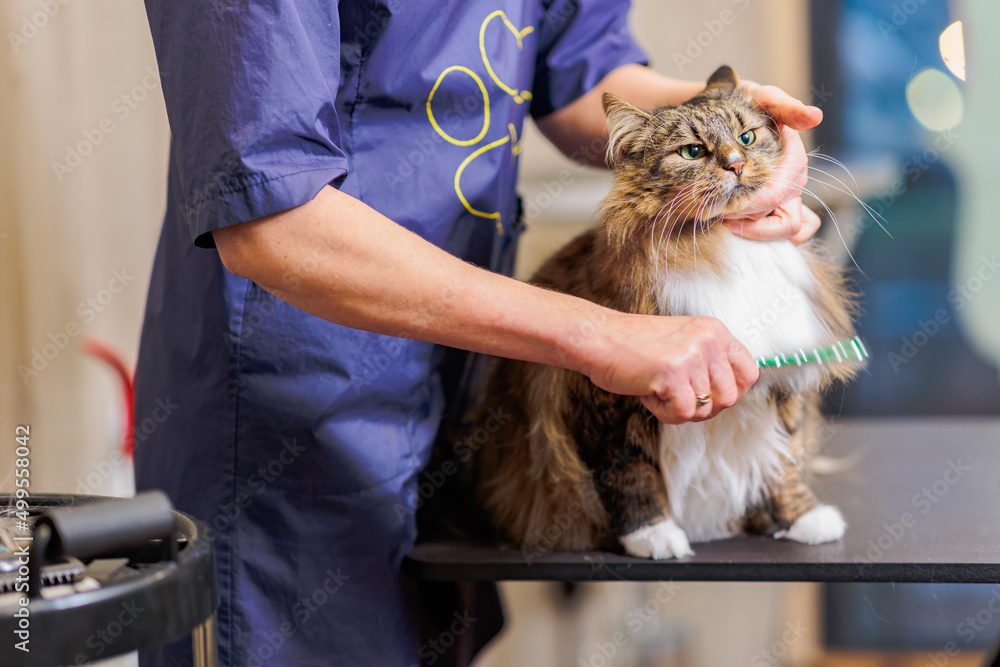 Fototapeta Grooming cat with tool for shedding hair
