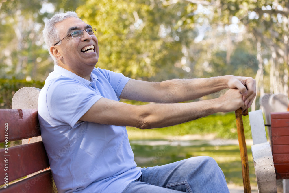 Fototapeta Happy senior man with walking cane at park