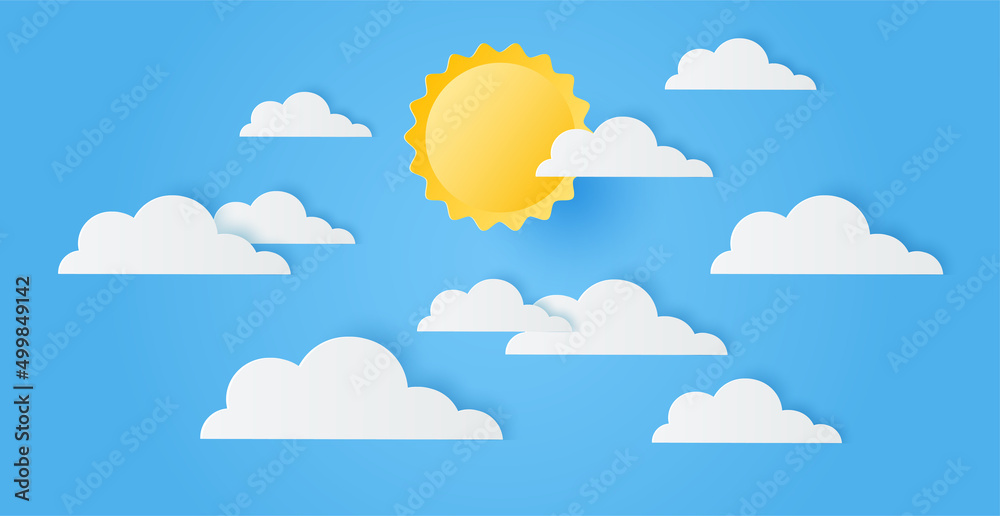 Fototapeta Paper cut of sun and clouds on blue sky for background