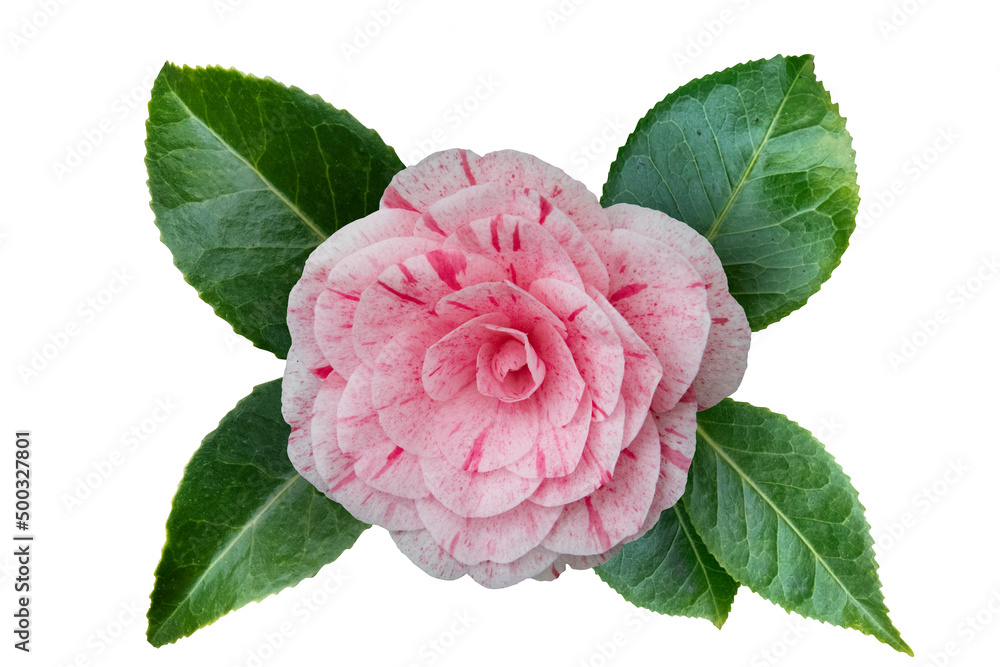 Fototapeta Single pink camelia flower and green leaves isolated on white background