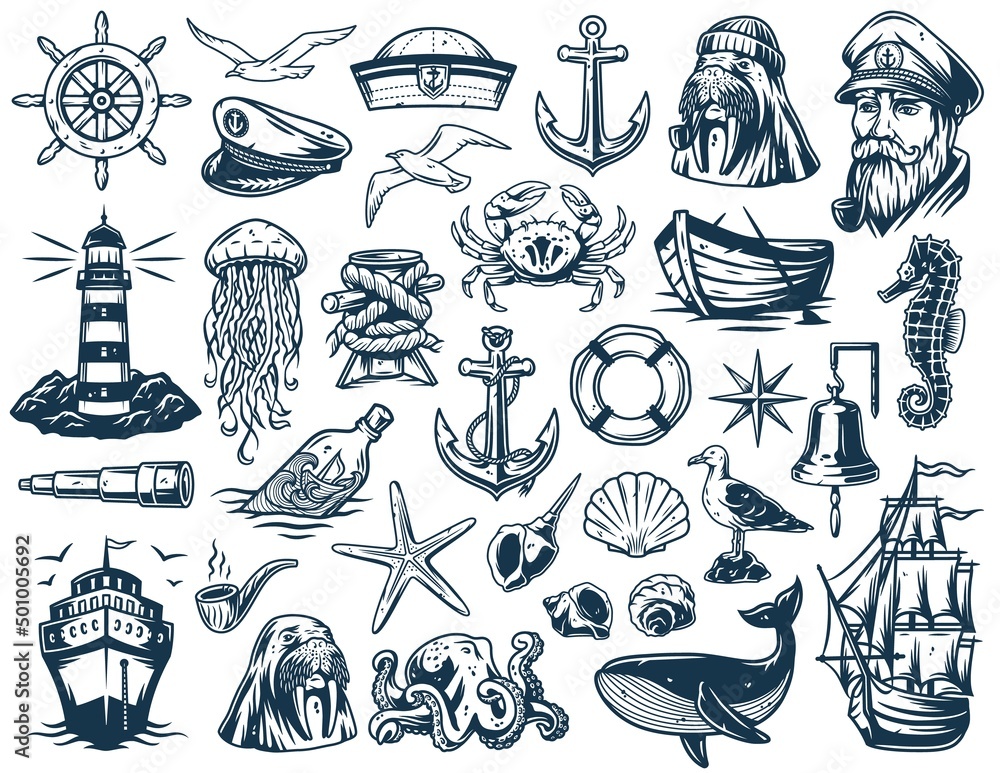 Fototapeta Nautical ocean lighthouse and walrus, sea marine anchor and captain cap, sealife