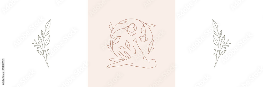 Fototapeta Minimalist contour human hand circled botanical stem with leaves decorated by na