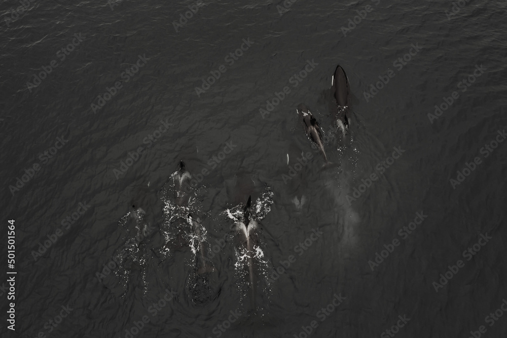 Fototapeta Aerial grayscale view of a pod of orcas swimming in high speed in the sea