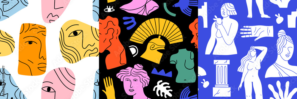 Fototapeta Set of ancient greek statue and classic vintage monument seamless pattern