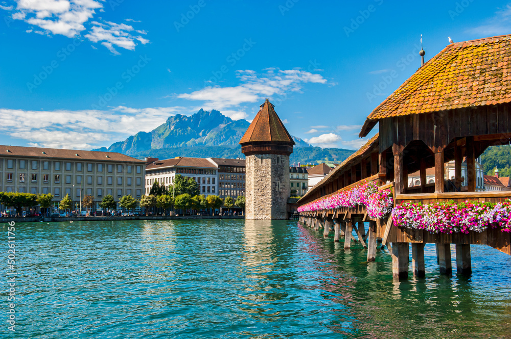 Fototapeta The Chapel Bridge and Water Tower in Lucerne in Switzerland