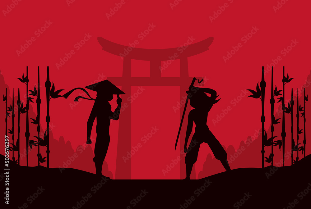 Fototapeta two ninjas with bamboo silhouettes
