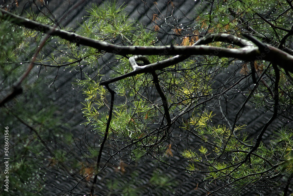 Fototapeta Pine tree branch, the roof of an ancient Yu Garden pavillion in background