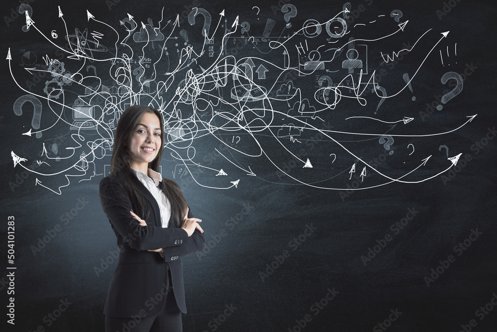 Fototapeta Portrait of attractive thoughtful young european businesswoman standing on chalkboard/blackboard wall background with arrows mesh sketch