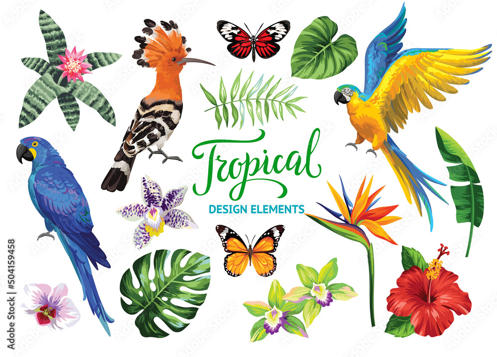 Fototapeta Tropical collection: exotic flowers, leaves, birds and butterflies