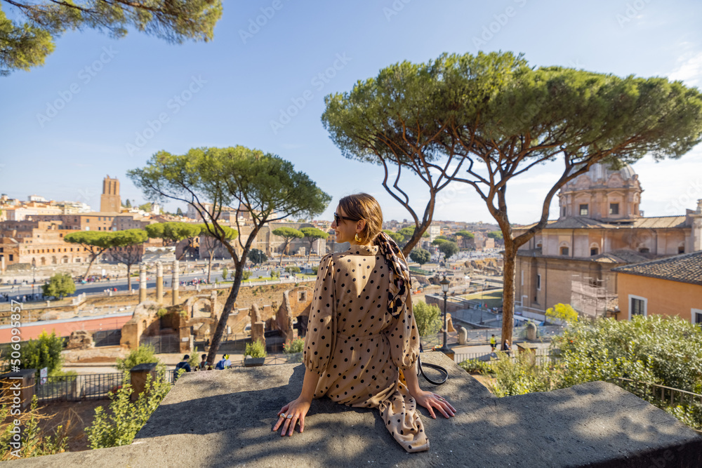 Fototapeta Woman enjoying beautiful view from above on the old centre of Rome