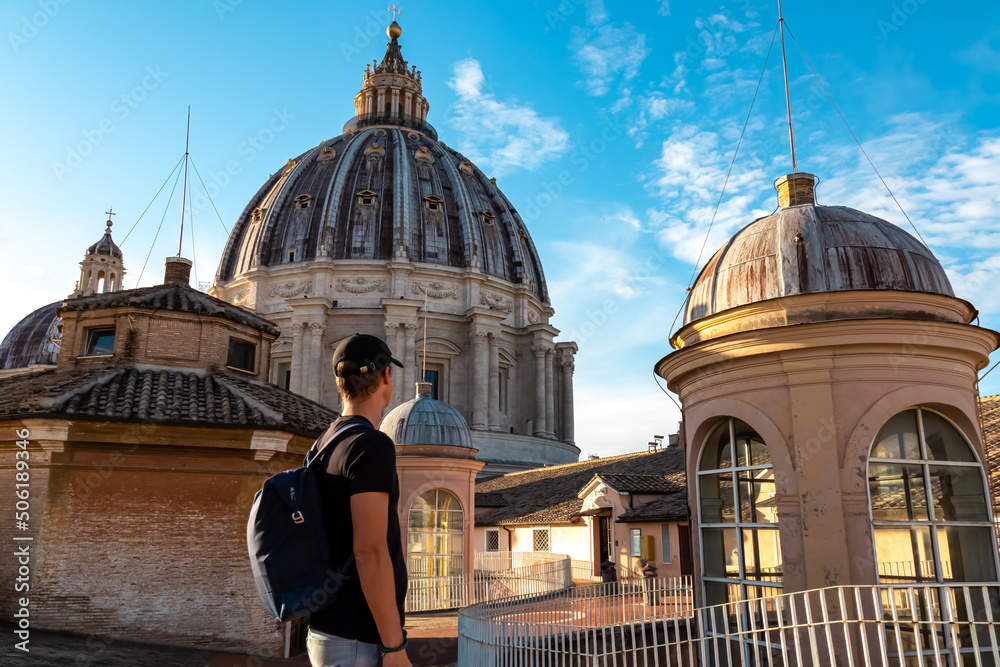 Fototapeta Tourist man with detailed close up view on Michelangelos Dome of St Peter Basilica in Vatican City, Rome, Lazio, Europe, EU