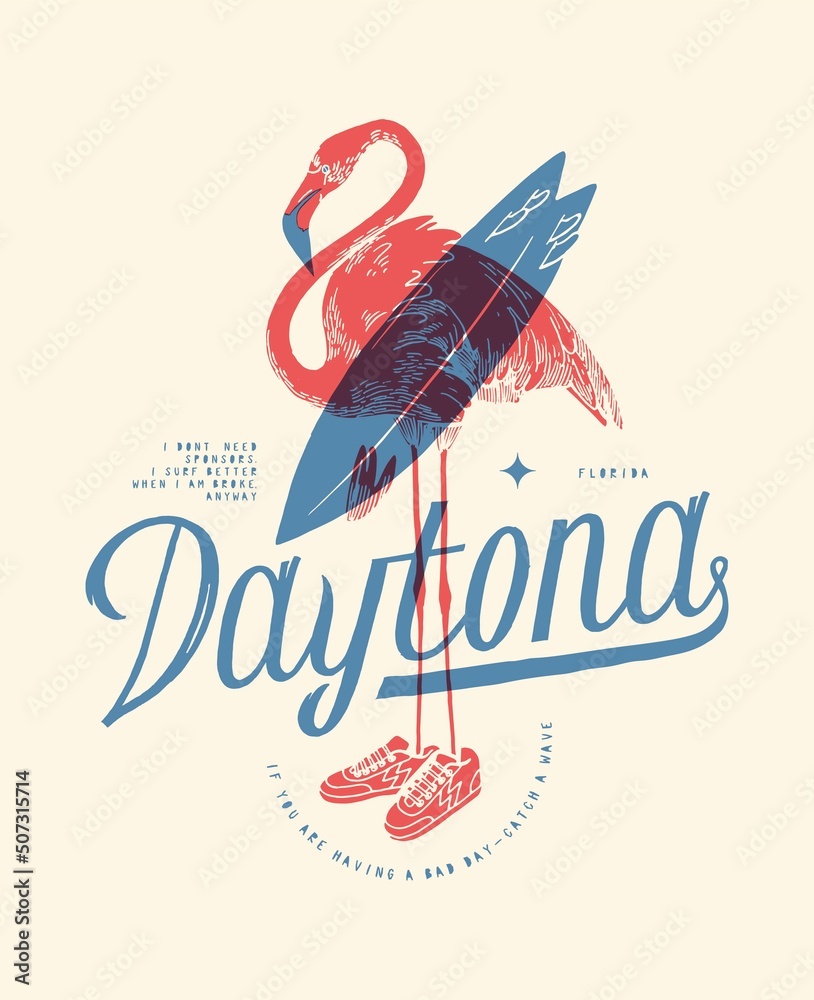 Fototapeta Daytona beach flamingo surfing vintage typography silkscreen t-shirt print vector illustration