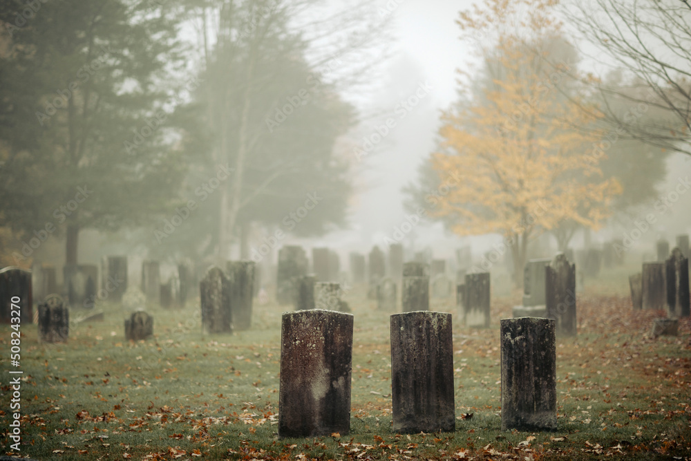 Fototapeta Three gravestones standing in a foggy graveyard during the fall