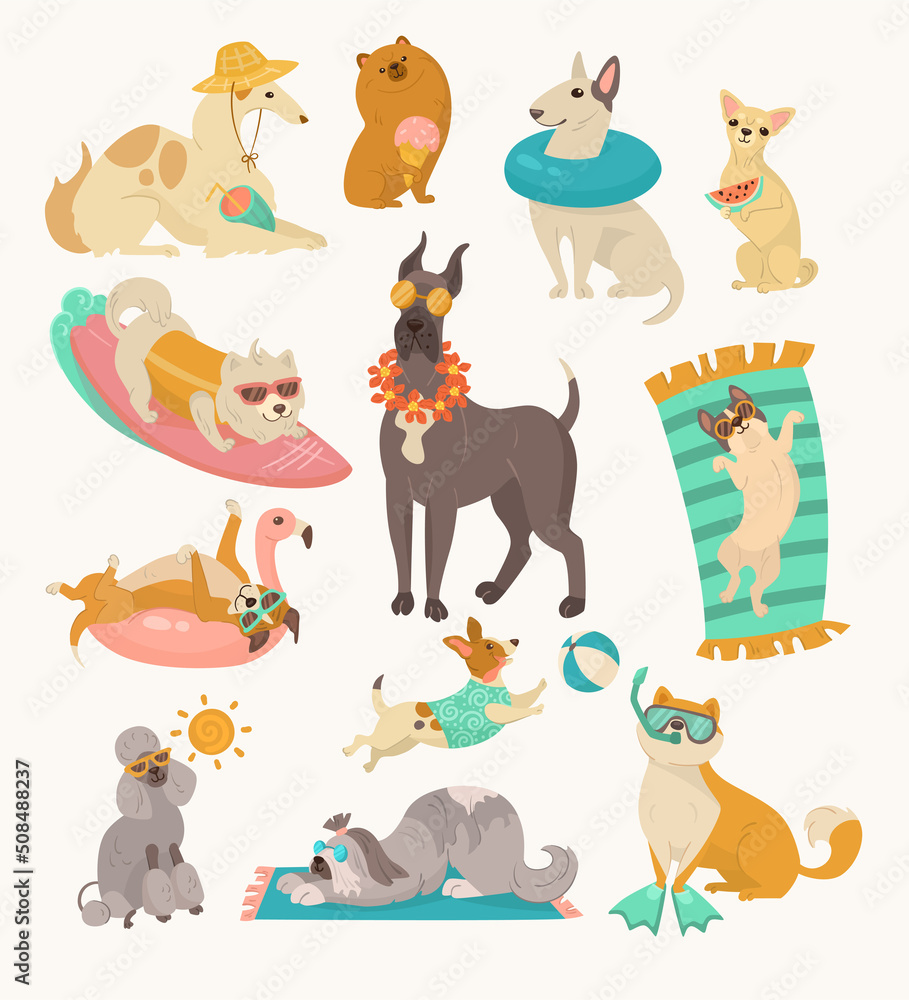 Fototapeta Funny comic dogs with beach accessories vector illustrations set
