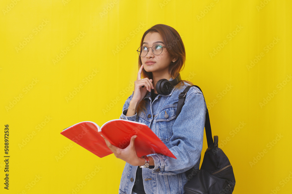 Fototapeta Thoughtful young asian college student standing while thinking an idea