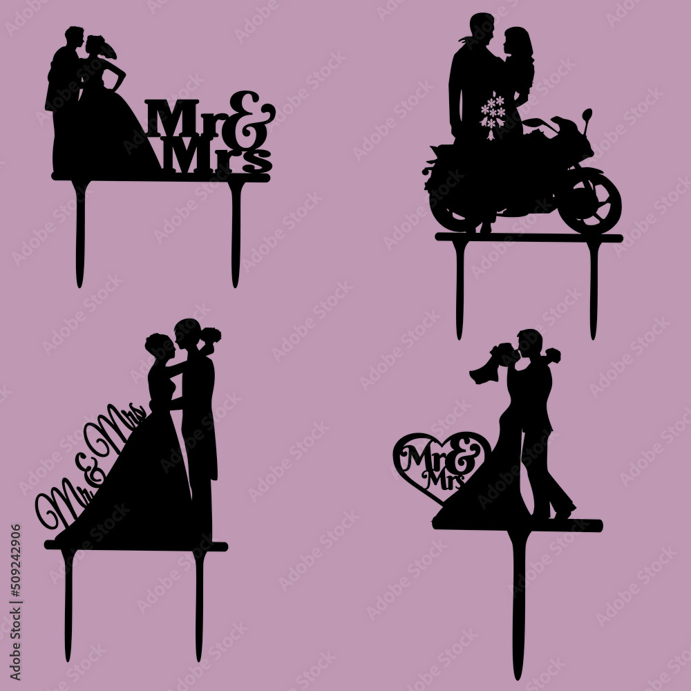 Fototapeta Silhouettes topper of wedding, bride, marriage, heart, motorbike