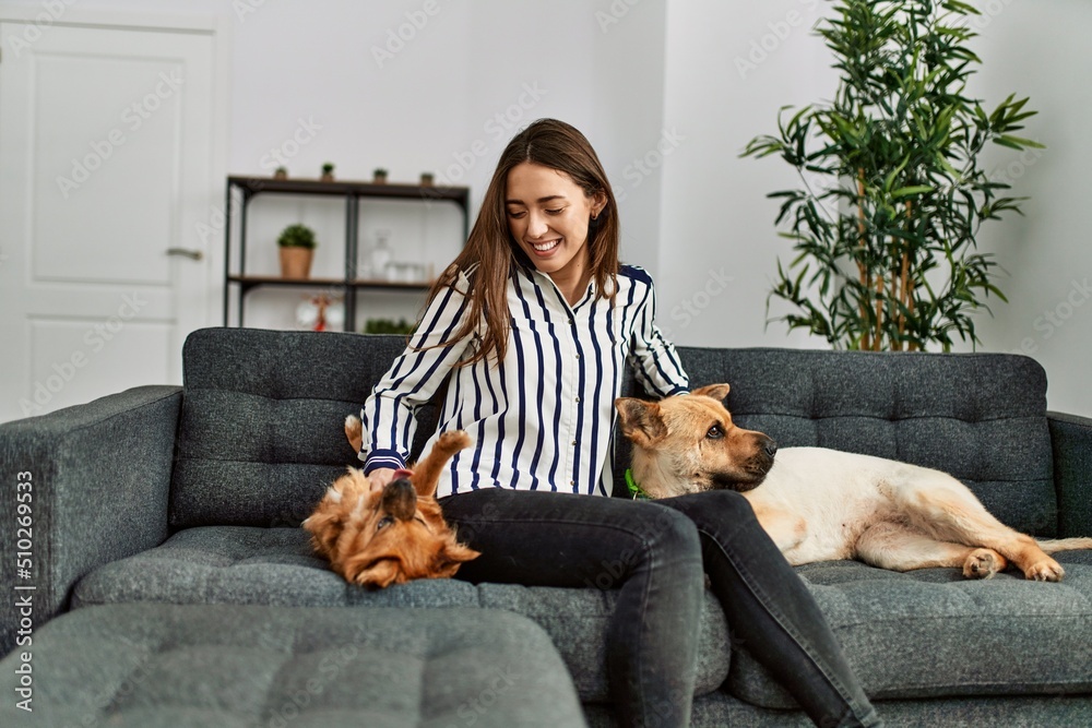 Fototapeta Young hispanic woman smiling confident sitting on sofa with dogs at home