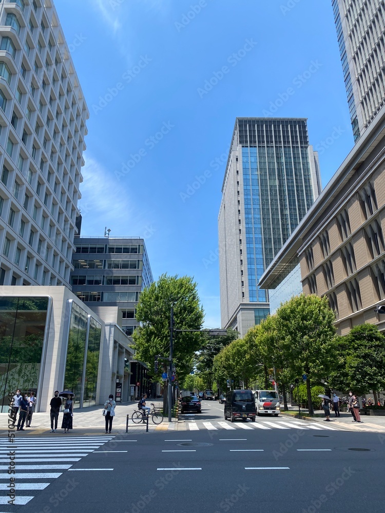 Fototapeta Street pedestrian’s crossings at the Tokyo Station square, city high buildings a