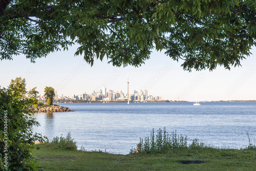 Fototapeta View on Toronto downtown and lake Ontario from behind the trees