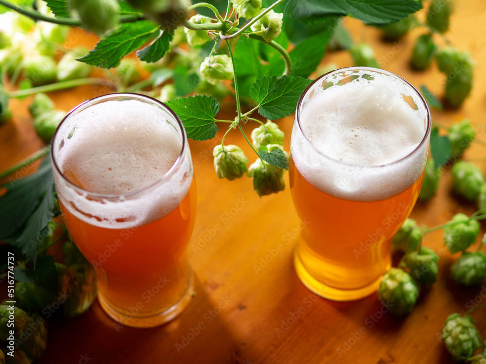 Fototapeta Two glasses of craft beer ipa , green cones of hops