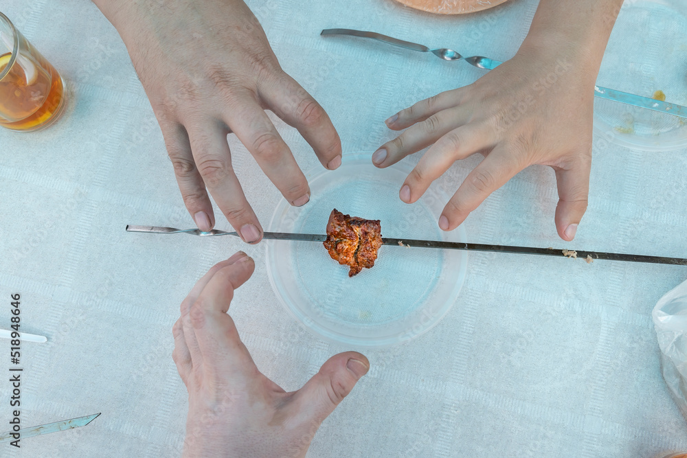 Fototapeta top view of the last juicy piece of meat on a metal skewer lying on a plastic pl