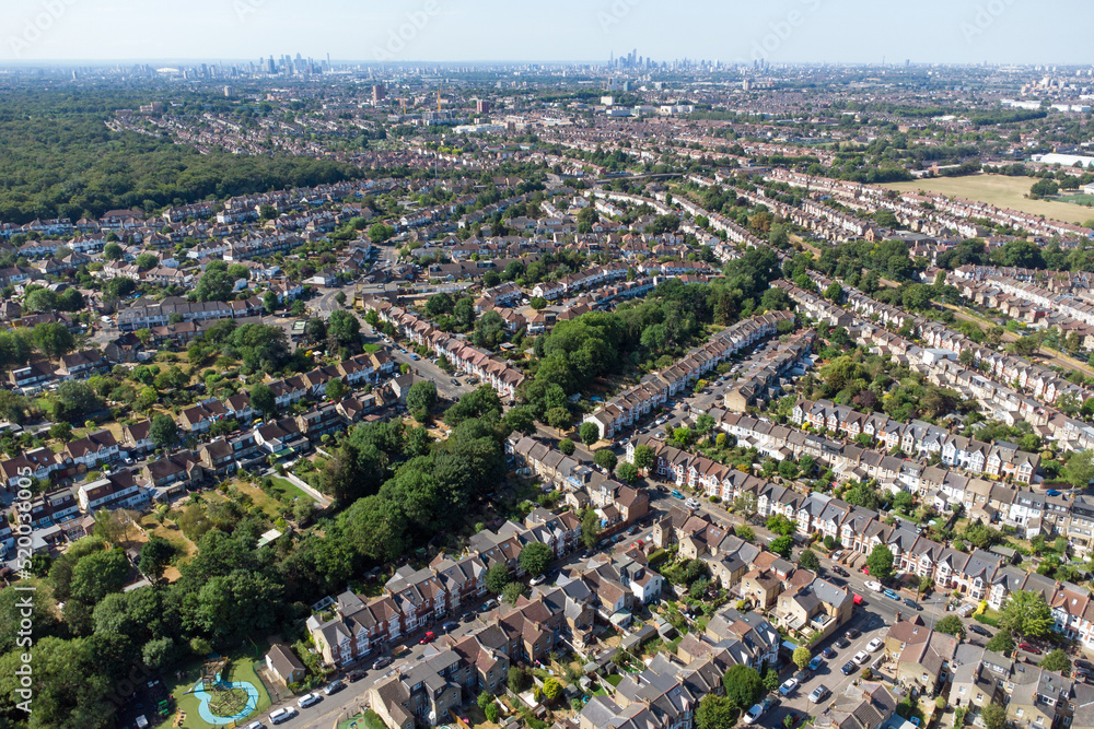 Fototapeta Aerial view Highams Park, a residential neighbourhood surrounded by forest and green parks on the outskirts of London