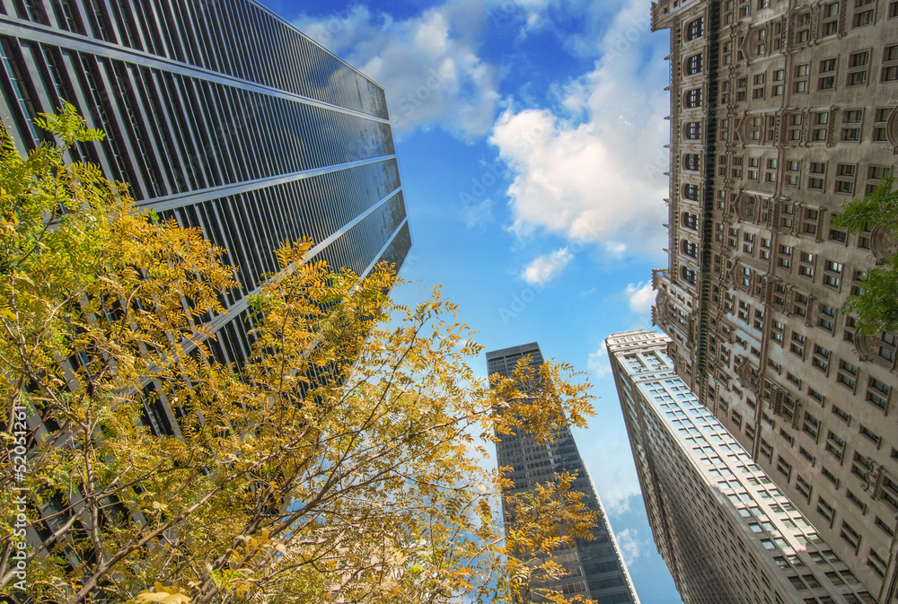 Fototapeta New York City. Upward view of Manhattan Buildings with trees