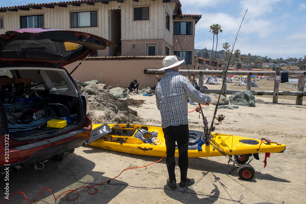 Fotografie A Kayaker Prepares for a Fishing Trip on a Beach