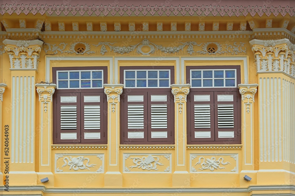 Fototapeta Peranakan shophouse louvered windows with Straits Chinese rococo architecture, l