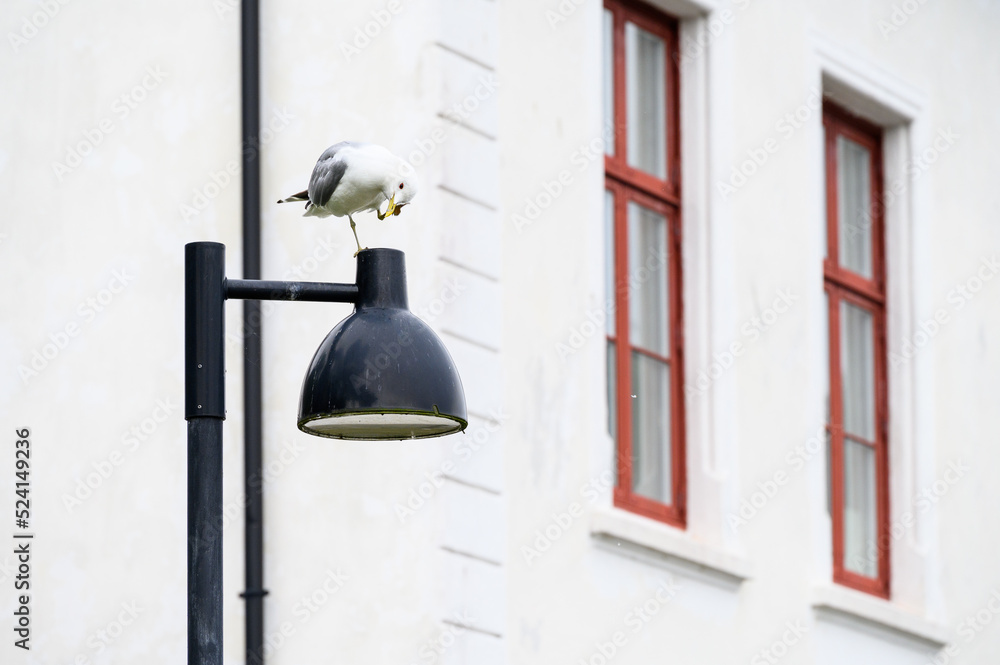 Fototapeta Seagull perched on a lamp post outside the school barracks of the historic Oscar