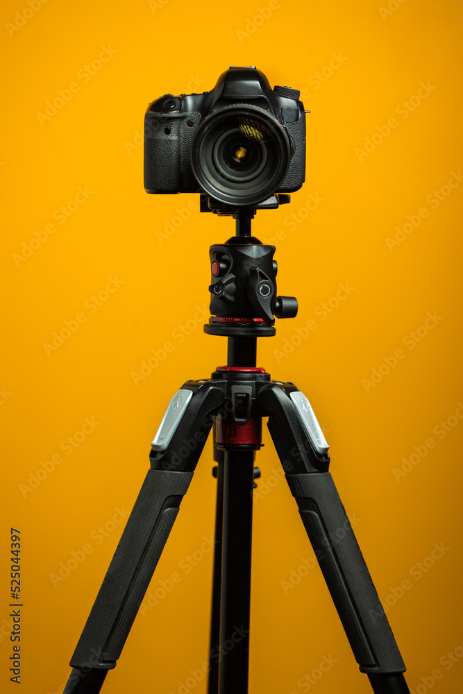 Fototapeta Dslr camera on tripod isolated with yellow background