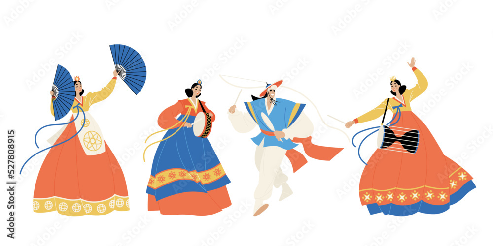 Fototapeta People dance and play musical instruments in traditional Korean clothes