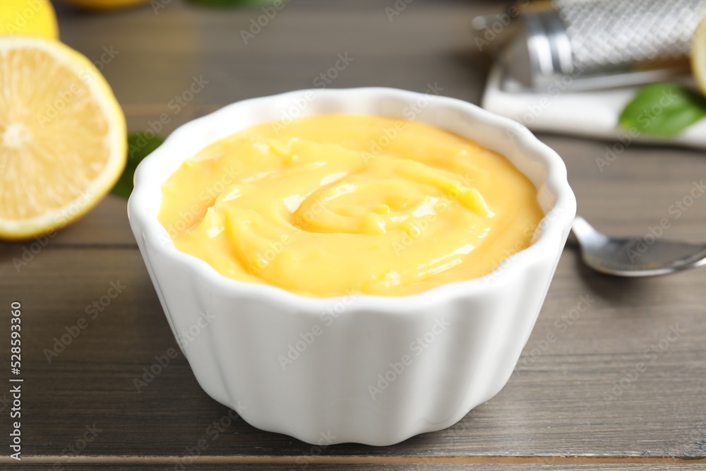 Fototapeta Delicious lemon curd in bowl on wooden table, closeup