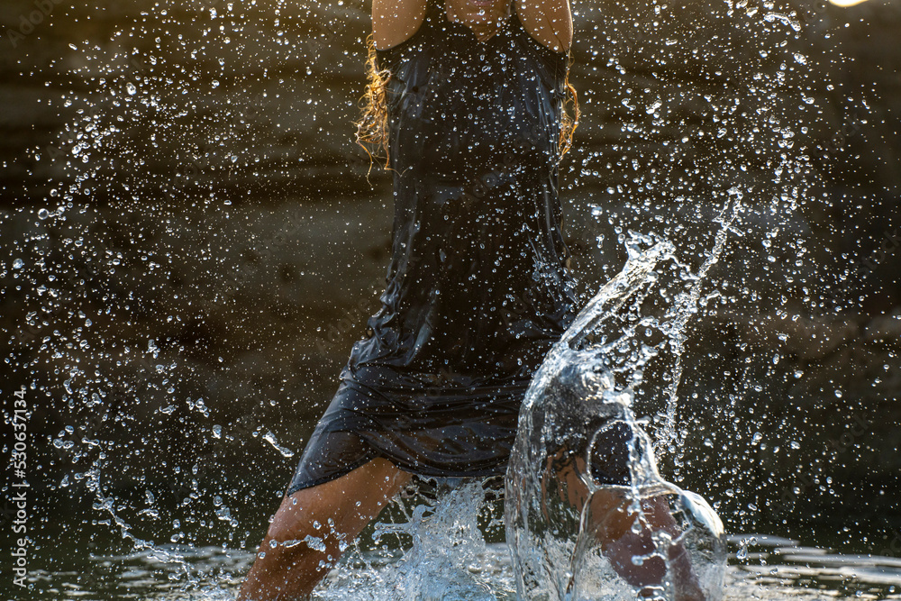 Fototapeta middle-aged woman dancing and throwing water in the air, Maioris beach, llucmajo