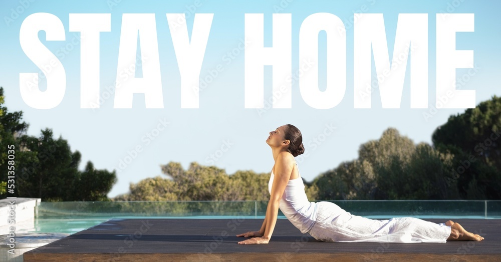 Fototapeta Caucasian woman practising yoga with words Stay Home during coronavirus covid19