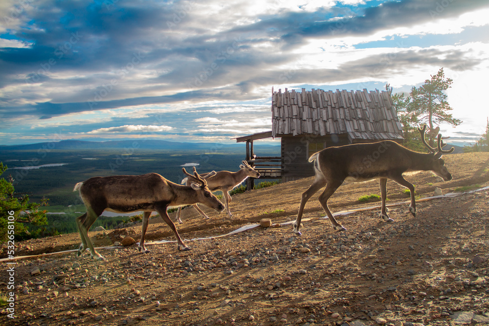 Fototapeta Free reindeers in front of santa's cabin in the mountains of Levi Lapland, Finla