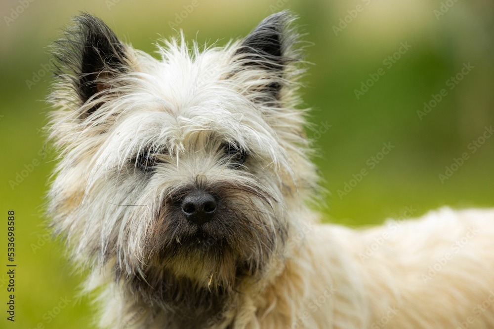 Fototapeta Close-up portrait of a Cairn Terrier before the green blurred background