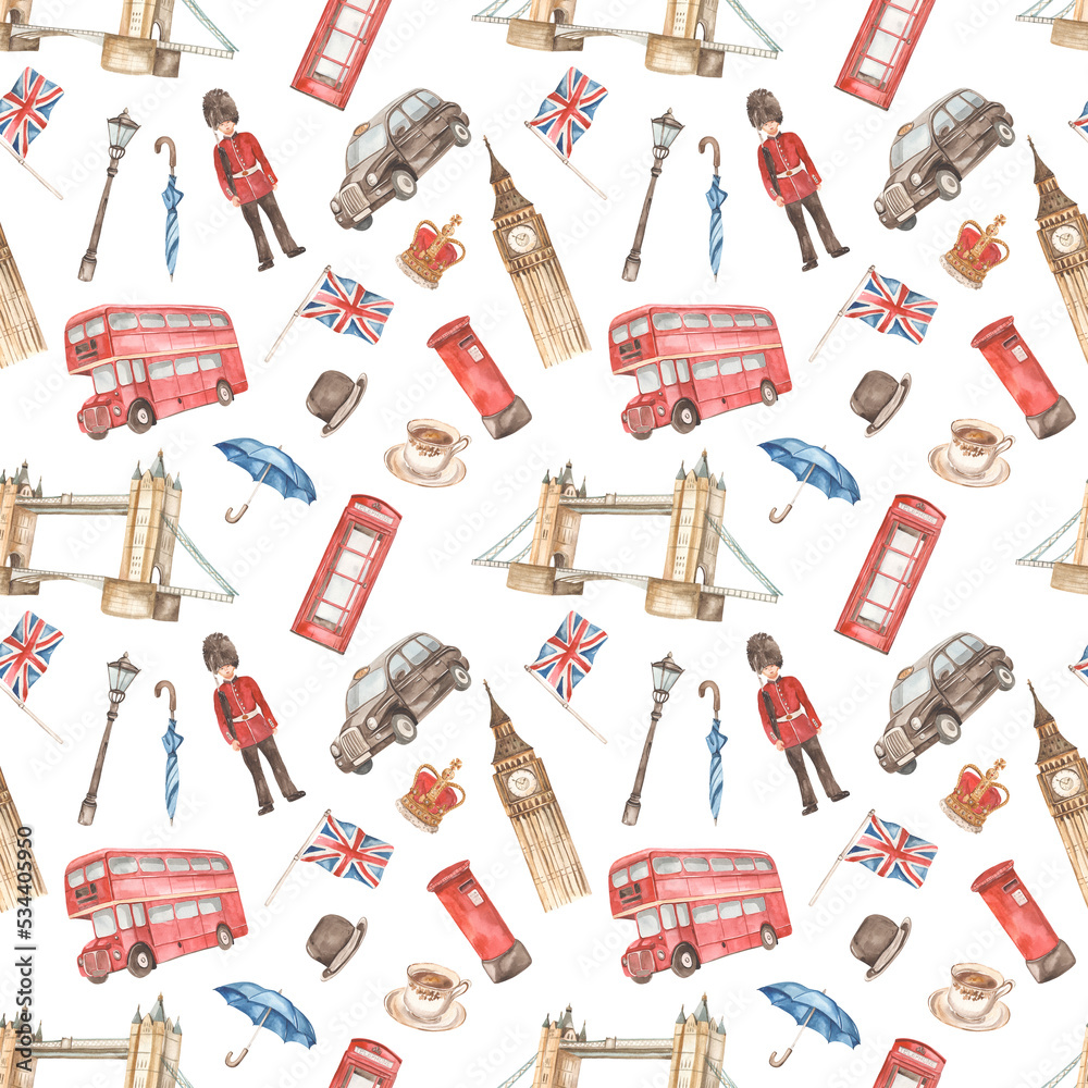Fototapeta Watercolor seamless pattern with London landmarks and symbols of England, big be