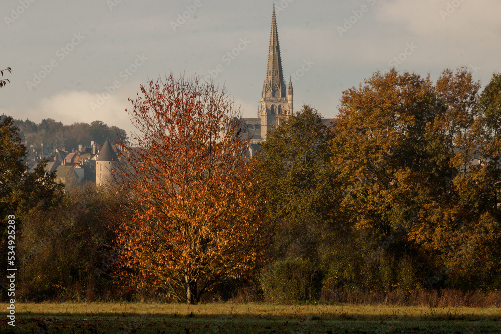 Fototapeta cathédrale Saint-Lazare à Autun en bourgogne derrière des arbres aux couleurs de