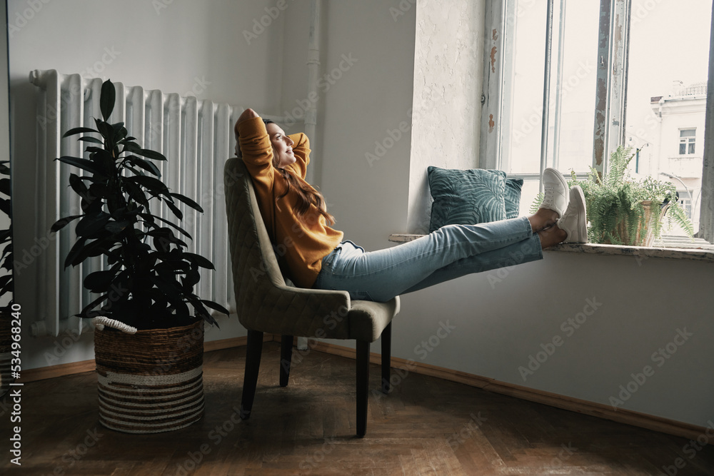 Fototapeta Beautiful young woman holding hands behind head while relaxing on the chair at h