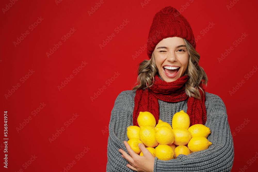 Fototapeta Young happy fun woman wear grey sweater scarf hat hold in hands bunch of lemons wink isolated on plain red background studio portrait