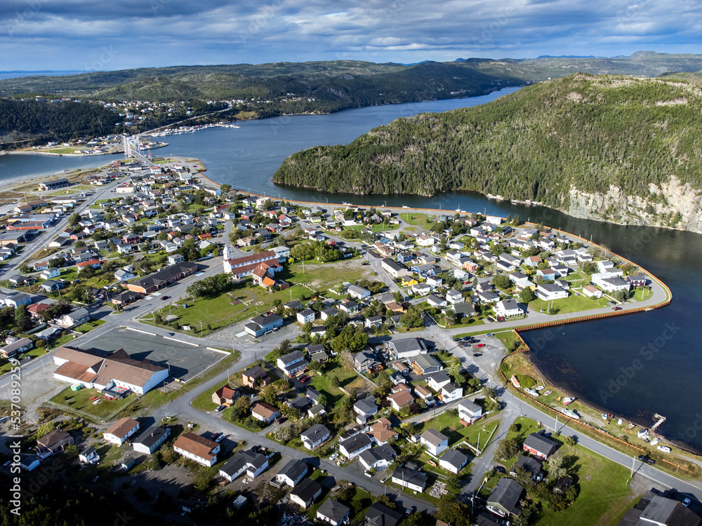 Fototapeta Aerial Newfoundland town and popular landmarks with a distant draw bridge and community heritage church