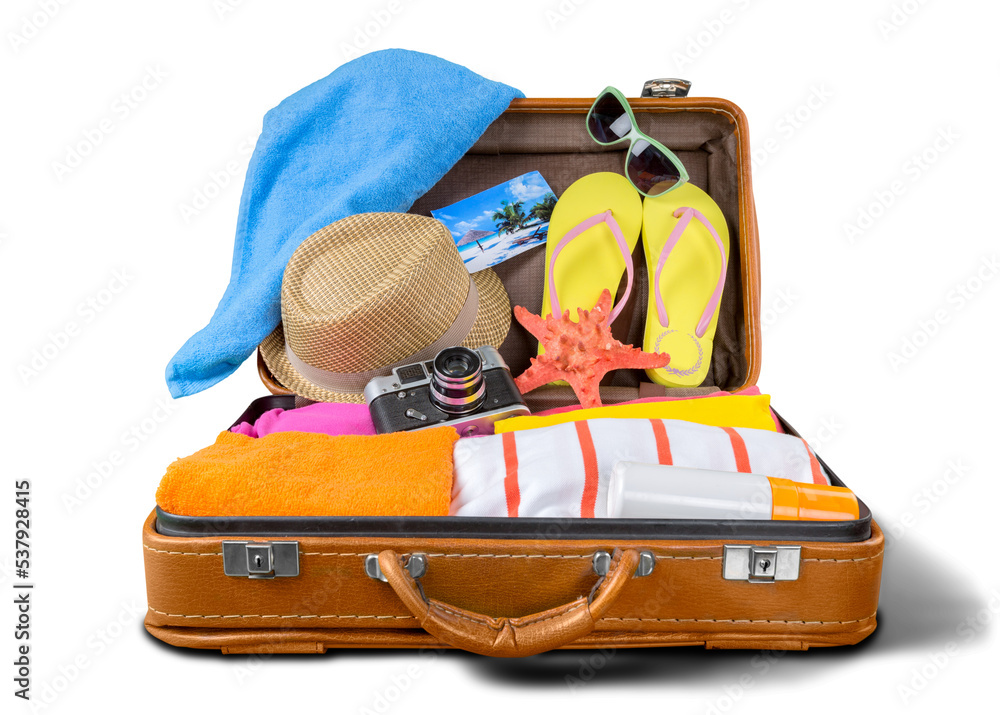Fototapeta Retro suitcase with travel objects on wooden board on natural background