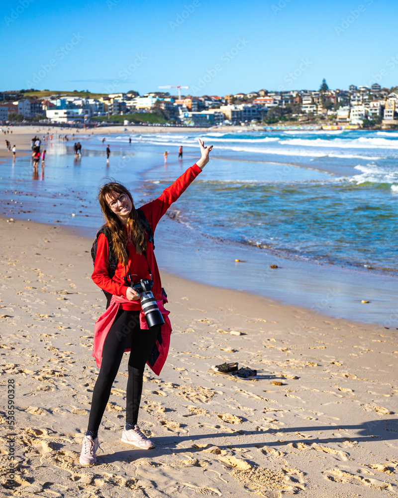 Fototapeta long-haired girl with camera enjoys the setting sun on bondi beach in syndey; fa