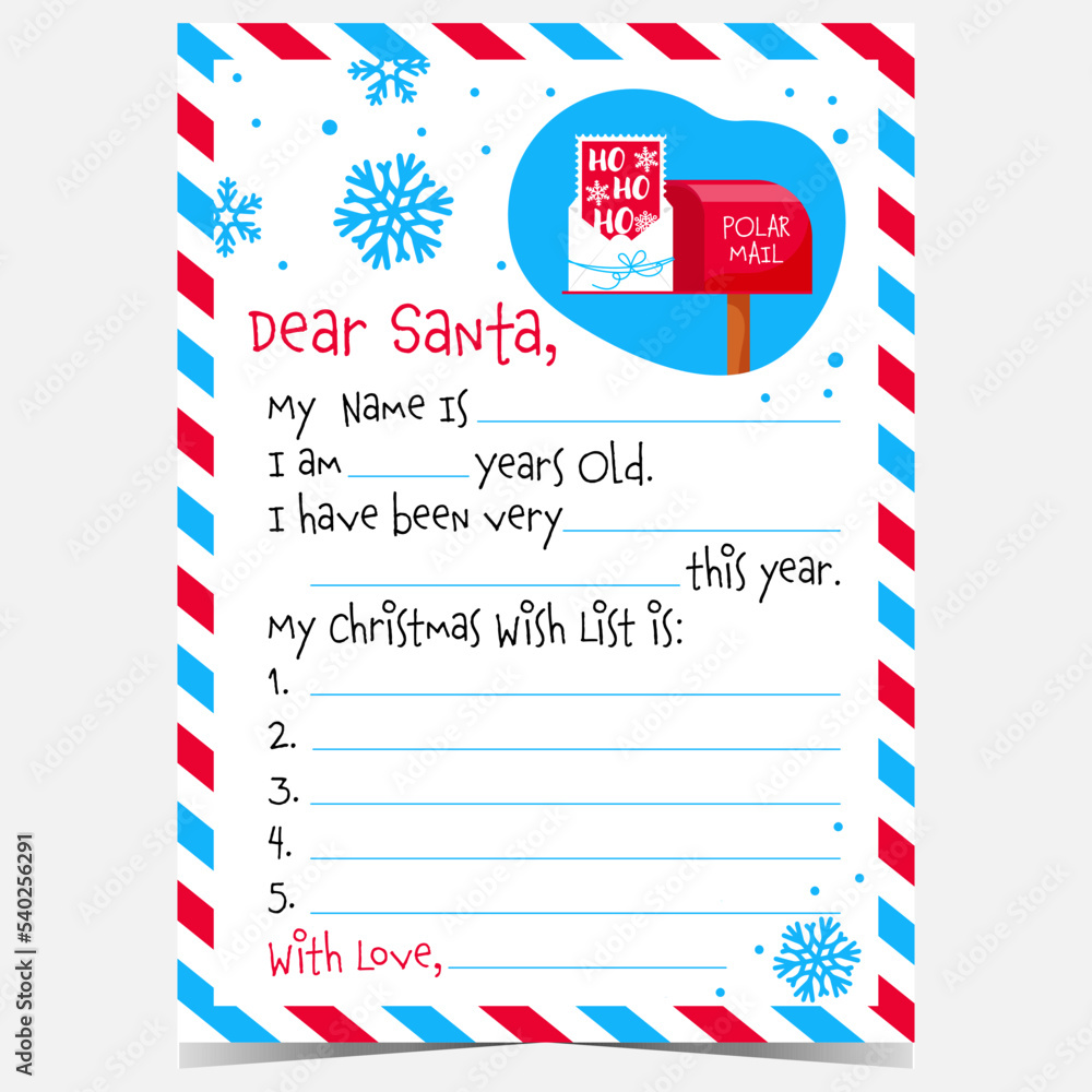 Fototapeta Christmas letter to Santa with blank template, polar mail postbox, snowflakes and air mail envelope with the blue red stripes frame