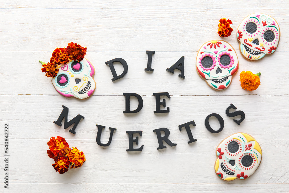 Fototapeta Text DIA DE MUERTOS with cookies and flowers on white wooden background
