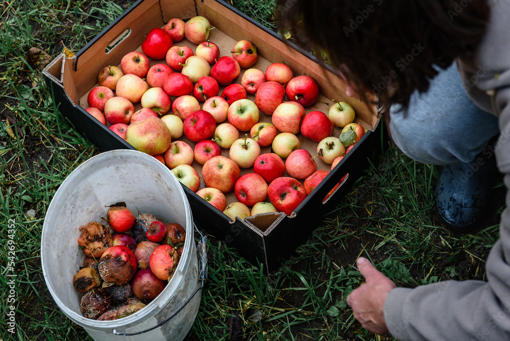 Fototapeta A woman's hand sorts rotten apples on the grass near a tree.