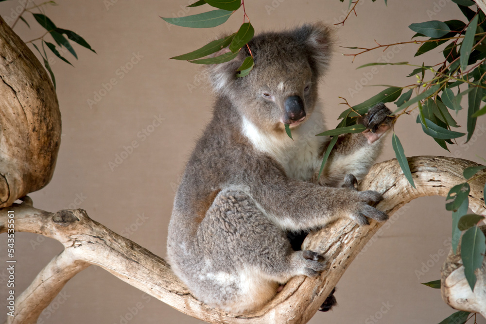 Fototapeta koalas are grey-brown in color with a white chest, they have white fluffy ears