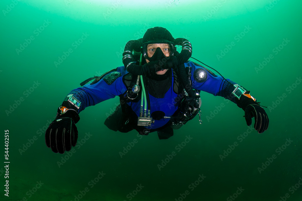 Fototapeta SCUBA diver in a drysuit and rebreather underwater in a cold, dark, murky quarry